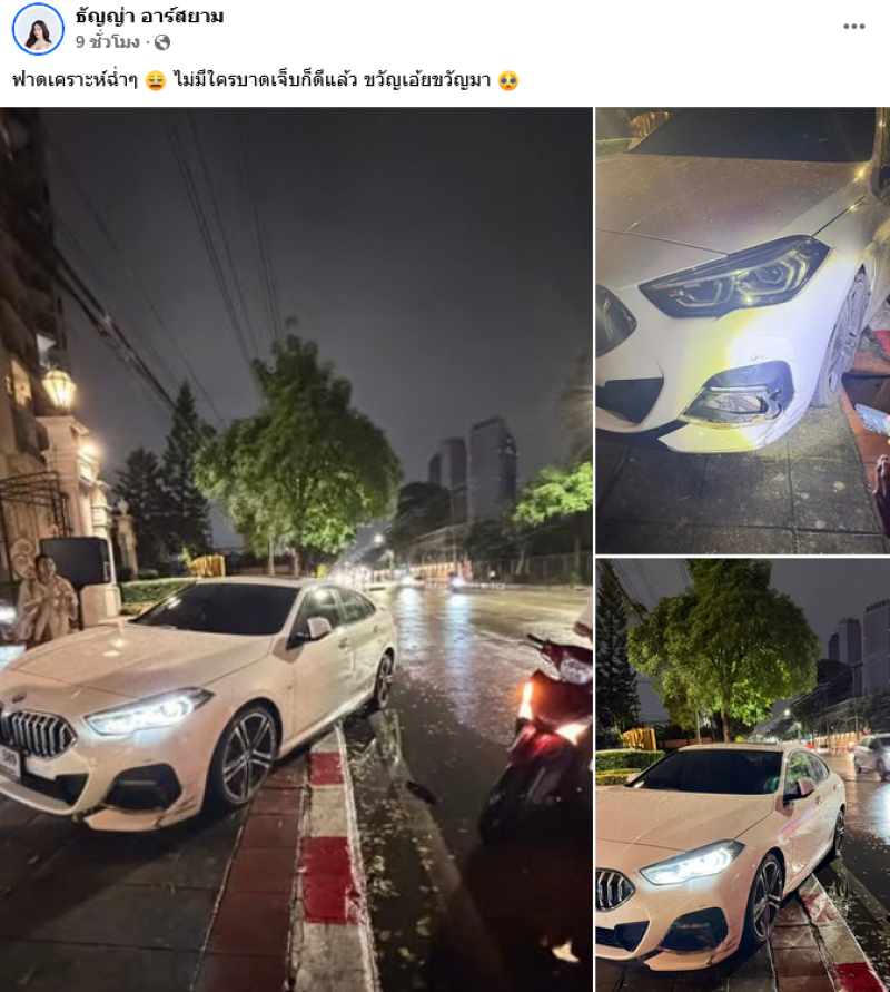 โดย ธัญญ่า ได้ออกมาโพสต์รถเกิดอุบัติเหตุ ขณะที่ฝนกำลังรินๆ พร้อมเขียนข้อความระบุว่า ฟาดเคราะห์ฉ่ำๆ ไม่มีใครบาดเจ็บก็ดีแล้ว ขวัญเอ้ยขวัญมา