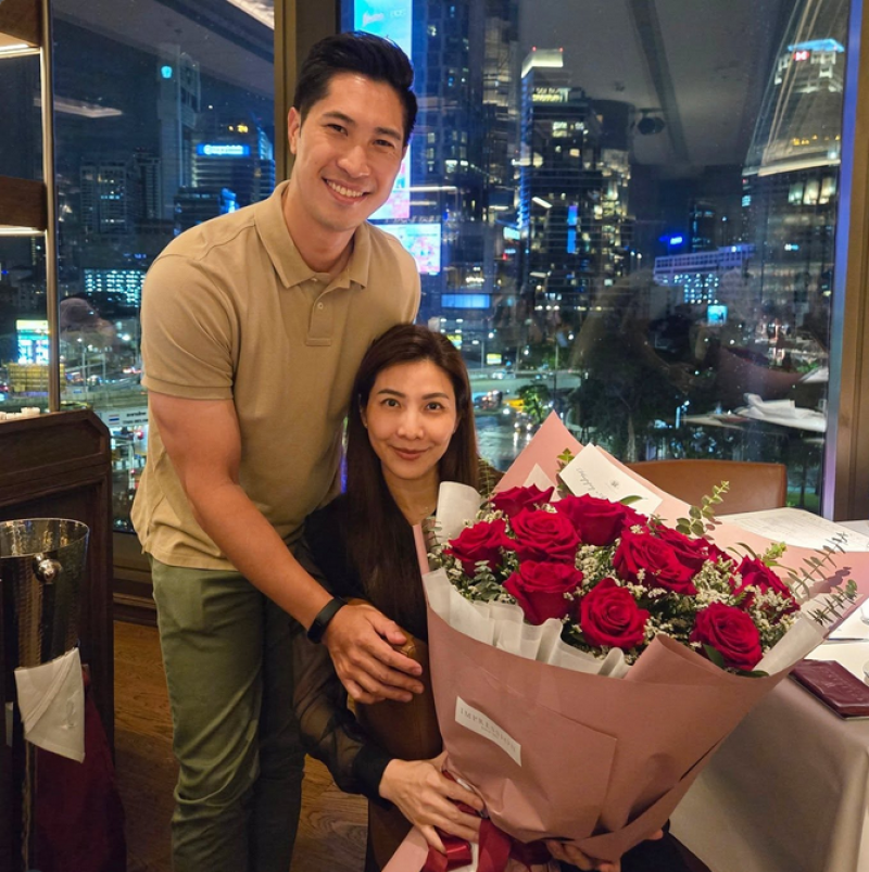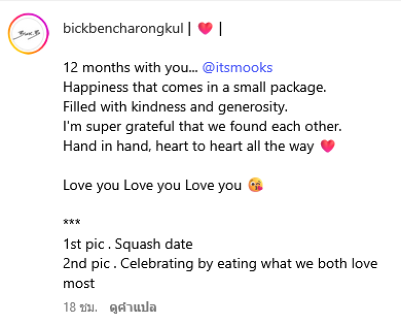 โดยระบุว่า 12 months with you Happiness that comes in a small package. Filled with kindness and generosity. I'm super grateful that we found each other. Hand in hand, heart to heart all the way Love you Love you Love you 1st pic . Squash date 2nd pic . Celebrating by eating what we both love most