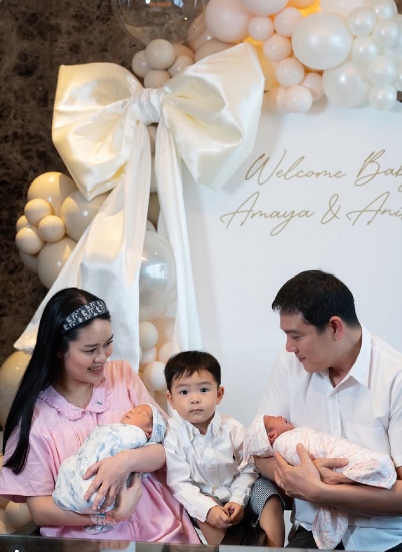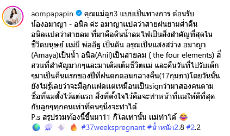 พร้อมเขียนแคปชั่นว่า คุณแม่ลูก3 แบบเป็นทางการ ต้อนรับน้องอมาญา - อนิล ค่ะ อมาญาเเปลว่าสายฝนยามค่ำคืน อนิลเเปลว่าสายลม ที่มาคือดินน้ำลมไฟเป็นสิ่งสำคัญที่สุดในชีวิตมนุษย์ เเม่มี พ่ออิฐ เป็นดิน อรุณเป็นแสงสว่าง อมาญา(Amaya)เป็นน้ำ อนิล(Anil)เป็นสายลม ( the four elements)