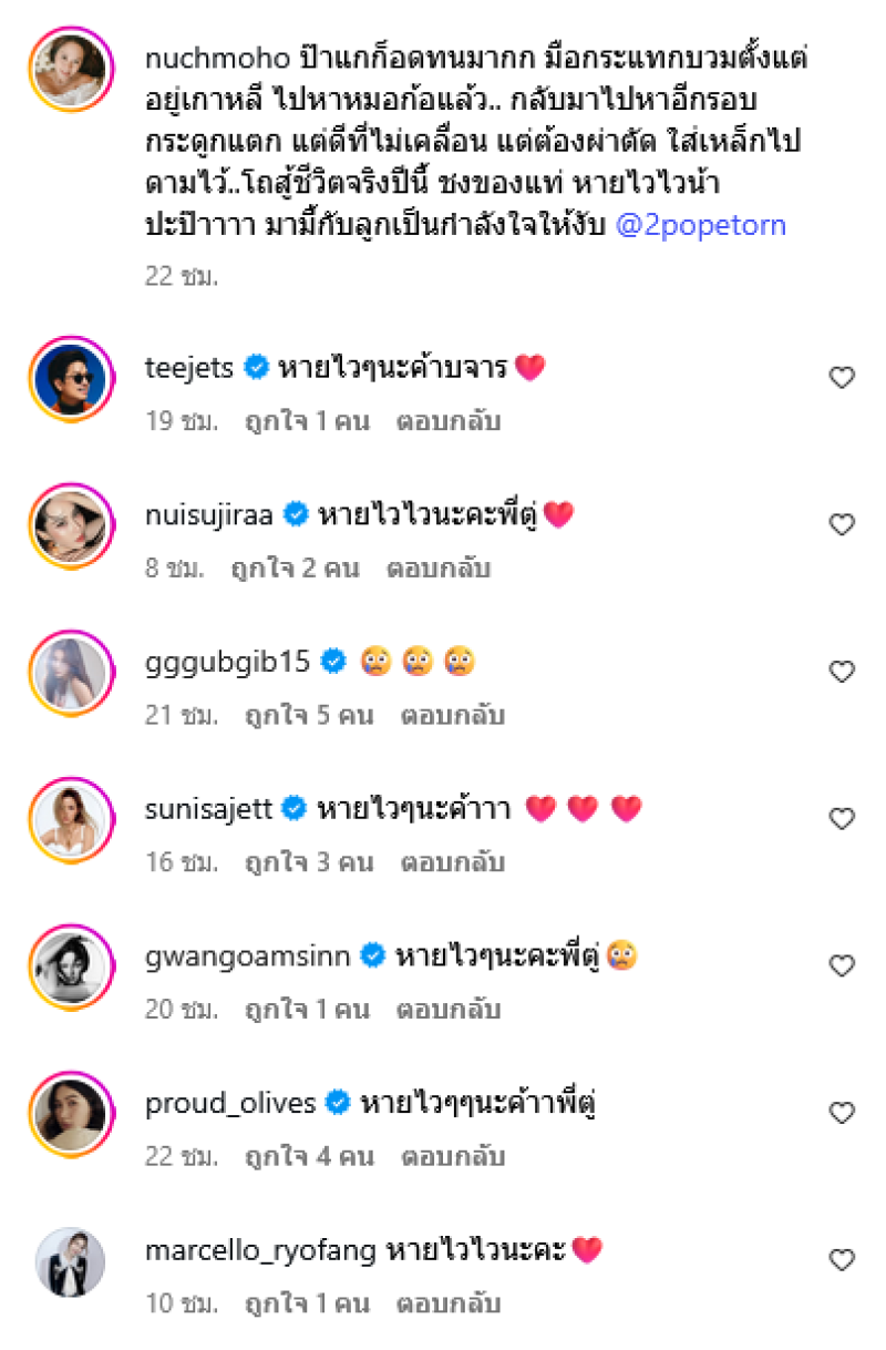 ไปหาหมอก้อแล้ว.. กลับมาไปหาอีกรอบ กระดูกแตก แต่ดีที่ไม่เคลื่อน แต่ต้องผ่าตัด ใส่เหล็กไปดามไว้..โถสู้ชีวิตจริงปีนี้ ชงของแท่ หายไวไวน้าปะป๊าาาา มามี้กับลูกเป็นกำลังใจให้งับ @2popetorn ท่ามกลางคนในวงการเเละเเฟนๆต่างส่งกำลังใจให้อย่างมาก