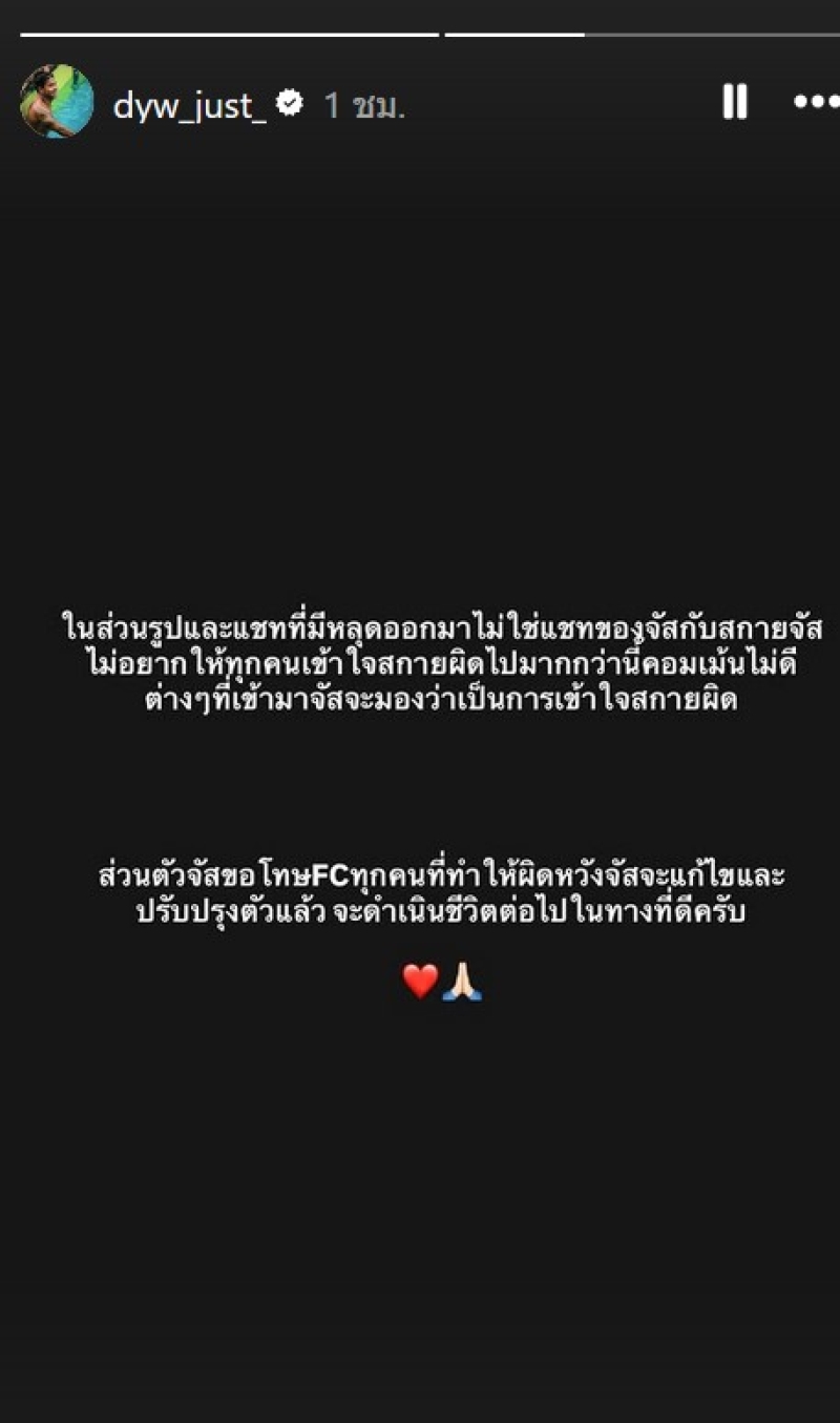 และอีโพสต์ก็ได้เผยว่า ในส่วนรูปและแชทที่มีหลุดออกมาไม่ใช่แชทของจัสกับสกายจัส ไม่อยากให้ทุกคนเข้าใจสกายผิดไปมากกว่านี้คอมเม้นไม่ดี ต่างๆที่เข้ามาจัสจะมองว่าเป็นการเข้าใจสกายผิด ส่วนตัวจัสขอโทษFCทุกคนที่ทําให้ผิดหวังจัสจะแก้ไขและ ปรับปรุงตัวแล้ว จะดําเนินชีวิตต่อไปในทางที่ดีครับ
