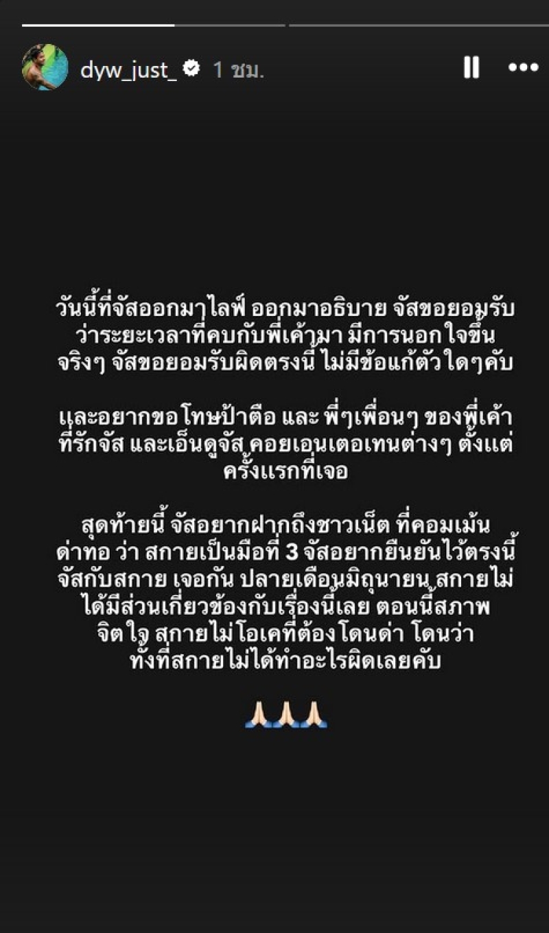 สุดท้ายนี้ จัสอยากฝากถึงชาวเน็ต ที่คอมเม้น ด่าทอว่า สกายเป็นมือที่ 3 จัสอยากยืนยันไว้ตรงนี้ จัสกับสกาย เจอกัน ปลายเดือนมิถุนายน สกายไม่ ได้มีส่วนเกี่ยวข้องกับเรื่องนี้เลย ตอนนี้สภาพ จิตใจู สุกายไม่โอเคที่ต้องโดนด่า โดนว่า ทั้งที่สกายไม่ได้ทําอะไรผิดเลยคับ