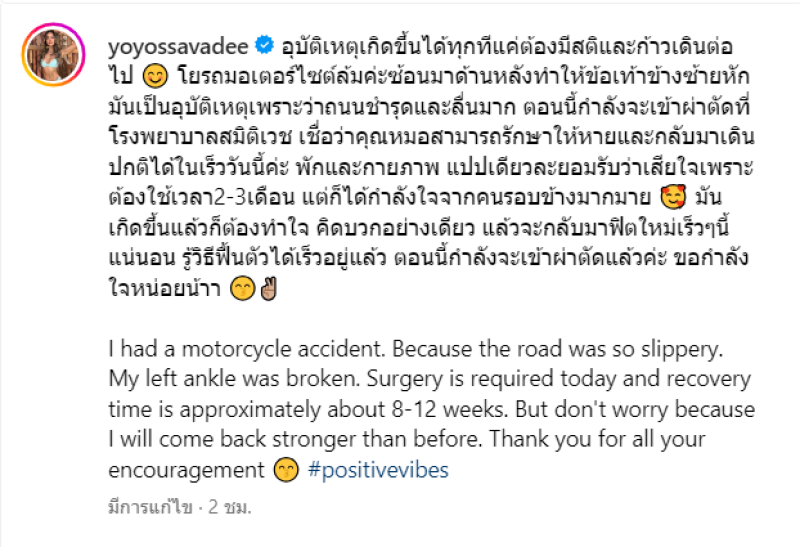 เรียกได้ว่า เป็นอดีตนักร้องสาวและนางแบบ อย่าง โย ยศวดี หัสดีวิจิตร ที่ล่าสุดทำเอาแฟนๆและเพื่อนๆต่างตกใจกันจำนวนมาก เมื่อเจ้าตัวได้ออกมาโพสต์ ภาพขณะที่เข้าโรงพยาบาล โดยได้ระบุข้อความว่า อุบัติเหตุเกิดขึ้นได้ทุกทีแค่ต้องมีสติและก้าวเดินต่อไป โยรถมอเตอร์ไซต์ล้มค่ะซ้อนมาด้านหลังทำให้ข้อเท้าข้างซ้ายหัก มันเป็นอุบัติเหตุเพราะว่าถนนชำรุดและลื่นมาก