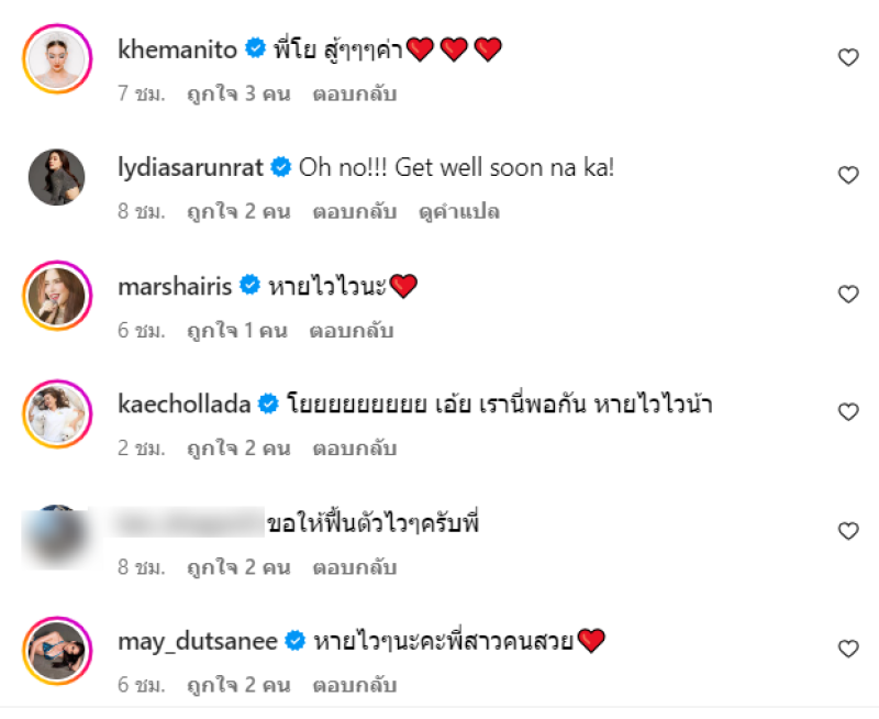 งานนี้ เหล่าเพื่อนๆและคนในวงการบันเทิง ร่วมไปถึงแฟนคลับก็ต่างเข้ามาให้กำลังใจและขอให้หายเร็วด้วยนั่นเอง