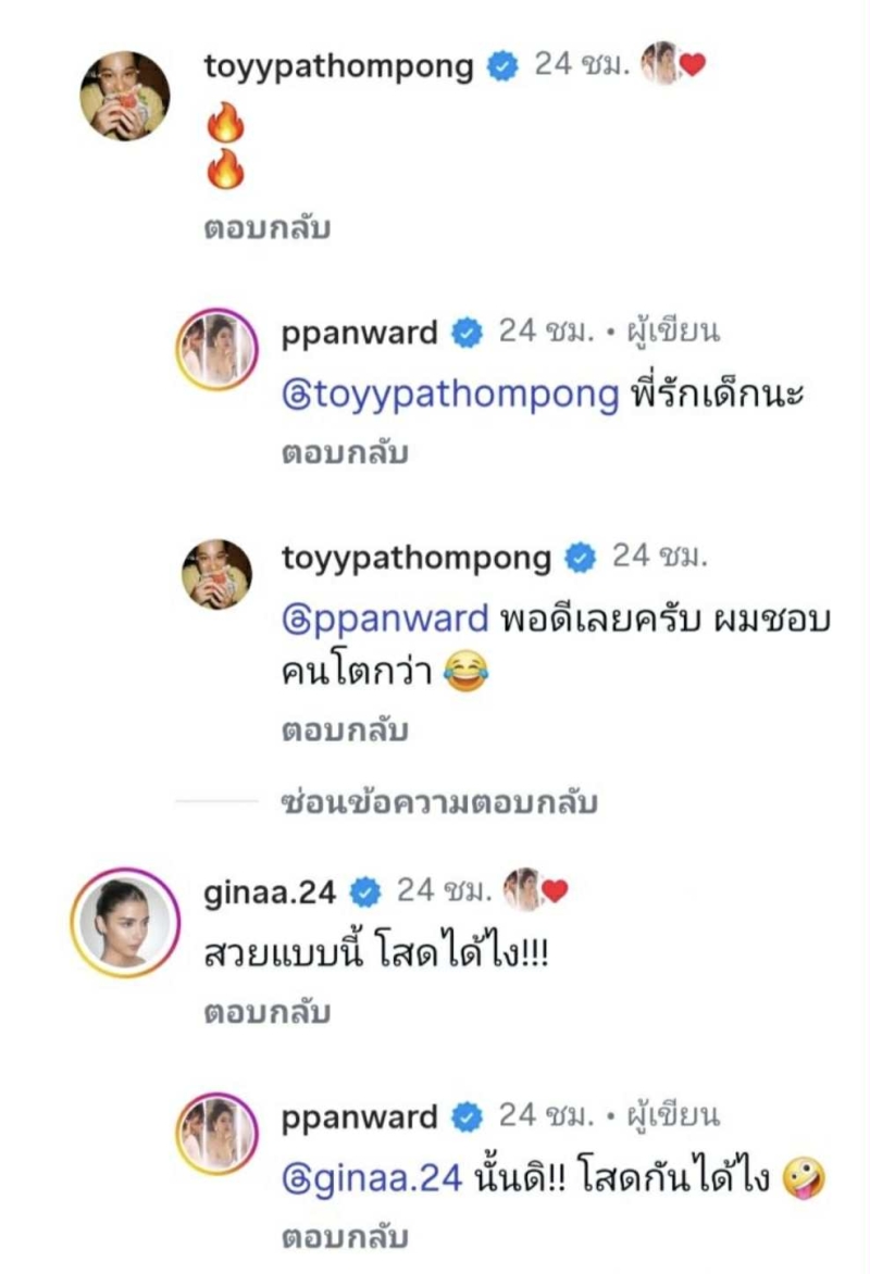 ความฮือฮายิ่งทวีคูณ เมื่อพระเอกหนุ่มรุ่นน้อง ทอย ปฐมพงศ์ เข้ามาคอมเมนต์ด้วยอีโมจิไฟลุกพรึ่บ ทำให้ผู้ติดตามหลายคนอดเอ็นดูไม่ได้
