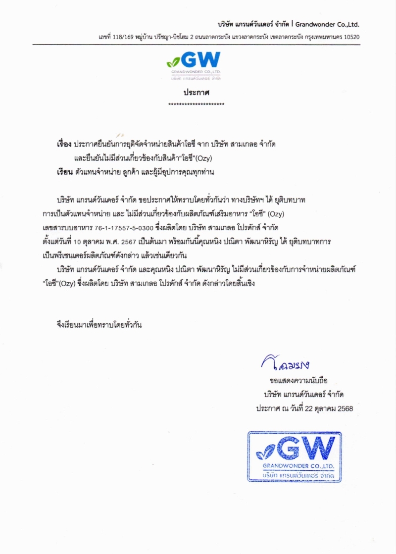ปัจจุบัน บริษัท แกรนด์วันเดอร์ฯ ได้พัฒนาผลิตภัณฑ์ สูตรใหม่ OZY TRIPLE S ภายใต้โรงงานผลิตที่ได้มาตรฐาน และผ่านการรับรองจาก อย. ถูกต้องครบถ้วน เพื่อให้มั่นใจว่า ผู้บริโภคทุกคน จะได้รับสิ่งที่ดีที่สุดและปลอดภัยที่สุด ขอให้ทุกคน ตรวจสอบข้อมูล และฉลากให้ถูกต้องก่อนตัดสินใจซื้อทุกครั้ง เพราะ สุขภาพและความปลอดภัยของลูกค้าทุกคน คือสิ่งที่หนิงให้ความสำคัญที่สุดเสมอค่ะ ขอความกรุณา อย่านำชื่อ หรือรูปภาพของหนิง ไปใช้ในเชิงพาณิชย์ โดยไม่ได้รับอนุญาติ นำมาซึ่งการเสียชื่อเสียงที่ตั้งใจทำงานมาตลอดมิเช่นนั้นจะดำเนินการตามกฏหมายทุกกรณี