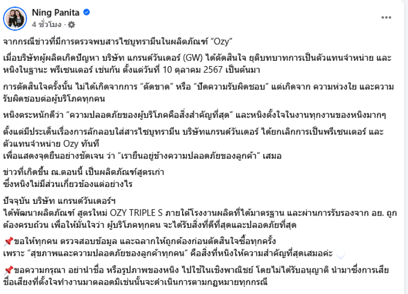 ล่าสุดทางด้าน หนิง ปณิตา ได้ออกมาโพสต์เคลื่อนไหวว่า จากกรณีข่าวที่มีการตรวจพบสารไซบูทรามีนในผลิตภัณฑ์ Ozy เมื่อบริษัทผู้ผลิตเกิดปัญหา บริษัท แกรนด์วันเดอร์ (GW) ได้ตัดสินใจ ยุติบทบาทการเป็นตัวแทนจำหน่าย และหนิงในฐานะ พรีเซนเตอร์ เช่นกัน ตั้งแต่วันที่ 10 ตุลาคม 2567 เป็นต้นมา การตัดสินใจครั้งนั้น ไม่ได้เกิดจากการ ตัดขาด หรือ ปัดความรับผิดชอบ แต่เกิดจาก ความห่วงใย และความรับผิดชอบต่อผู้บริโภคทุกคน