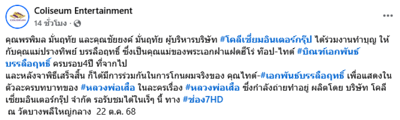 และหลังจาพิธีเสร็จสิ้น ก็ได้มีการร่วมกันในการโกนผมจริงของ คุณไทด์-#เอกพันธ์บรรลือฤทธิ์ เพื่อแสดงในตัวละครบทบาทของ #หลวงพ่อเสือ ในละครเรื่อง #หลวงพ่อเสือ ซึ่งกำลังถ่ายทำอยู่ ผลิตโดย บริษัท โคลีเซี่ยมอินเตอร์กรุ๊ป จำกัด รอรับชมได้ในเร็ๆ นี้ ทาง #ช่อง7HD