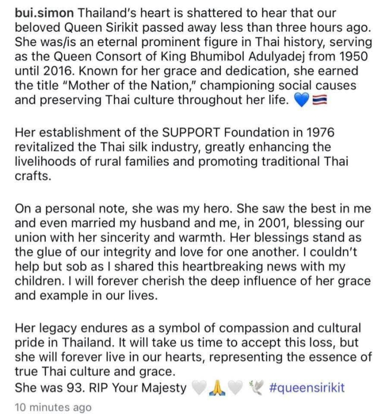 หัวใจของคนไทยแตกสลายเมื่อได้ยินว่า สมเด็จพระนางเจ้าสิริกิติ์ พระบรมราชินีนาถ อันเป็นที่รักของเรา ได้เสด็จสวรรคตเมื่อไม่ถึง 3 ชั่วโมงที่แล้ว สมเด็จพระพันปีหลวงทรงเป็นบุคคลสำคัญในประวัติศาสตร์ไทย ทรงดำรงพระยศเป็นพระบรมราชินีนาถเคียงข้างพระบาทสมเด็จพระเจ้าอยู่หัวภูมิพลอดุลยเดช ตั้งแต่ปี 1950 จนถึงปี 2016