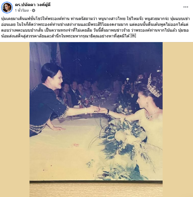 บุ๋มเคยมาเดินแฟชั่นโชว์ให้พระองค์ท่าน ท่านตรัสถามว่า หนูนางสาวไทย ใช่ไหมจ๊ะ หนูสวยมากจ่ะ บุ๋มแบบเข่าอ่อนเลย ในใจก็คิดว่าพระองค์ท่านช่างสง่างามและมีพระสิริโฉมงดงามมาก แต่ตอนนั้นตื่นเต้นพูดไม่ออกได้แต่ตอบว่าเพคะแบบปากสั่น เป็นความทรงจำที่ไม่เคยลืม วันนี้ตื่นมาพบข่าวร้าย ว่าพระองค์ท่านจากไปแล้ว บุ๋มขอน้อมส่งเสด็จสู่สวรรคาลัยและสำนึกในพระมหากรุณาธิคุณอย่างหาที่สุดมิได้