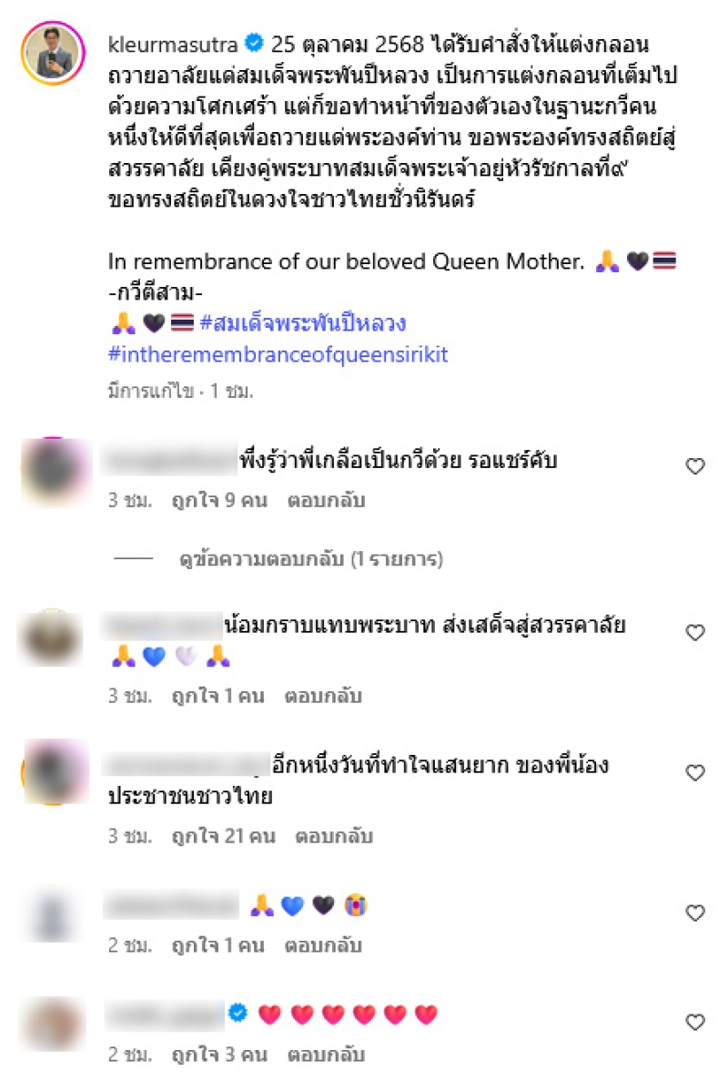 25 ตุลาคม 2568 ได้รับคำสั่งให้แต่งกลอนถวายอาลัยแด่สมเด็จพระพันปีหลวง เป็นการแต่งกลอนที่เต็มไปด้วยความโศกเศร้า แต่ก็ขอทำหน้าที่ของตัวเองในฐานะกวีคนหนึ่งให้ดีที่สุดเพื่อถวายแด่พระองค์ท่าน