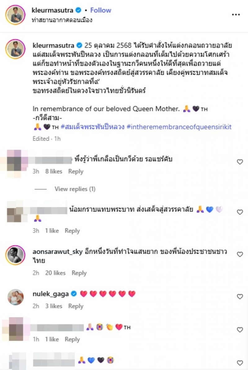 25 ตุลาคม 2568 ได้รับคำสั่งให้แต่งกลอนถวายอาลัยแด่สมเด็จพระพันปีหลวง เป็นการแต่งกลอนที่เต็มไปด้วยความโศกเศร้า แต่ก็ขอทำหน้าที่ของตัวเองในฐานะกวีคนหนึ่งให้ดีที่สุด เพื่อถวายแด่พระองค์ท่าน ขอพระองค์ทรงสถิตย์สู่สวรรคาลัย เคียงคู่พระบาทสมเด็จพระเจ้าอยู่หัวรัชกาลที่ 9 ขอทรงสถิตย์ในดวงใจชาวไทยชั่วนิรันดร์