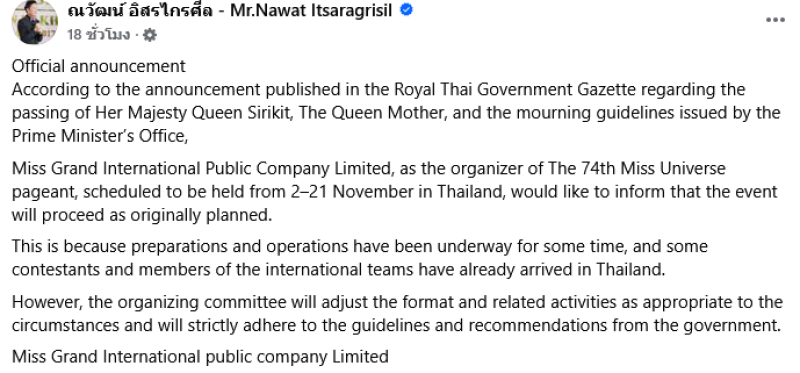 บริษัท มิสแกรนด์ อินเตอร์เนชั่นแนล จำกัด (มหาชน) ในฐานะผู้จัดการประกวด Miss Universe ครั้งที่ 74 ซึ่งมีกำหนดจัดขึ้นระหว่างวันที่ 2-21 พฤศจิกายน ณ ประเทศไทย ขอเรียนให้ทราบว่า การจัดงานจะดำเนินต่อไปตามกำหนดการเดิม ทั้งนี้ เนื่องจากการเตรียมงานและการดำเนินงานต่างๆ ได้เริ่มขึ้นมาระยะหนึ่งแล้ว และผู้เข้าประกวดบางส่วนรวมถึงทีมงานจากต่างประเทศได้เดินทางมาถึงประเทศไทยเป็นที่เรียบร้อย