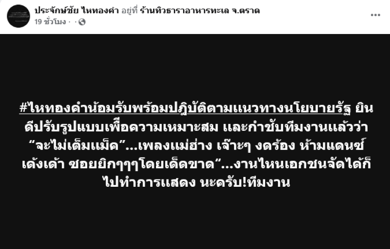 ไหทองคำน้อมรับพร้อมปฏิบัติตามแนวทางนโยบายรัฐ ยินดีปรับรูปแบบเพื่อความเหมาะสม และกำชับทีมงานแล้วว่าจะไม่เต็มแม็ค เพลงแม่ ฮ่างเจ๊าะๆ งดร้อง ห้ามแดนช์เด้งเด้า ซอย ยิกๆๆๆโดยเด็ดขาด งานไหนเอกชน จัดได้ก็ไปทำการแสดงนะครับ ทีมงาน
