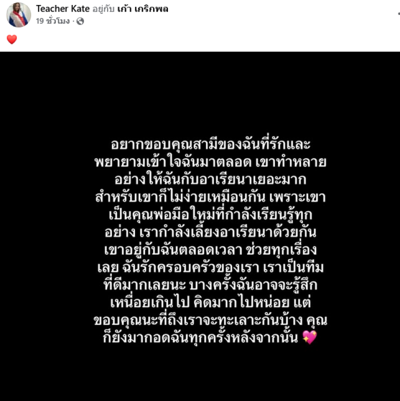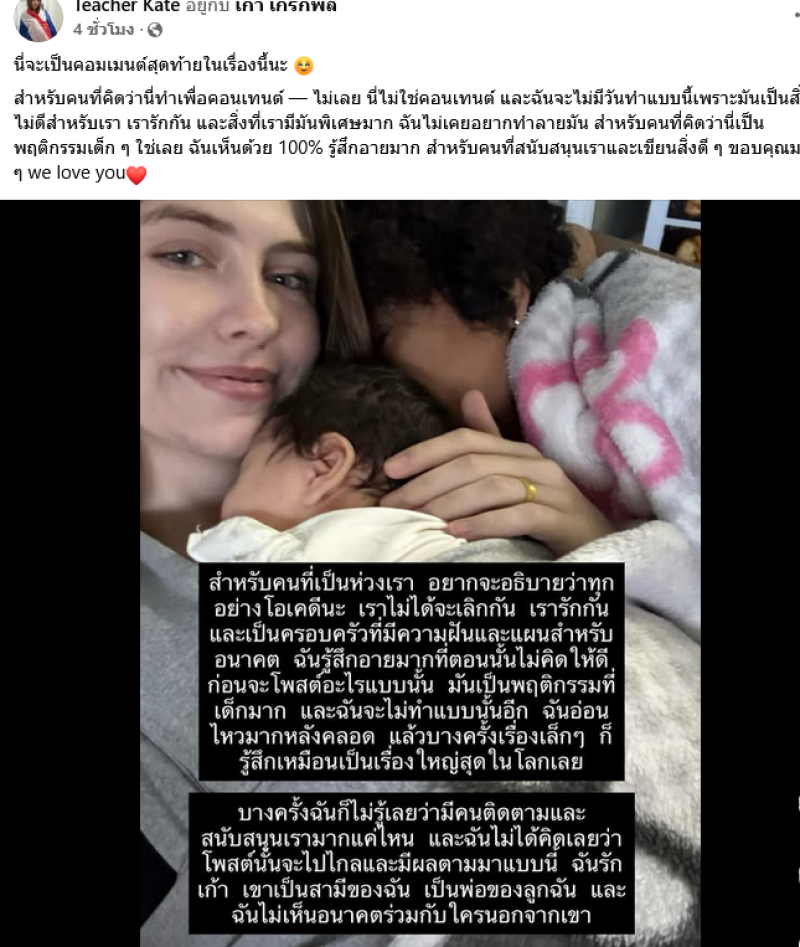 จากกรณีที่ก่อนหน้านี้นักร้องหนุ่ม เก้า เกริกพล ได้ออกมาโพสต์ชี้แจงความสัมพันธ์กับภรรยา ที่มีภาวะซึมเศร้าหลังคลอดเเละได้มีการโพสต์เลิกรากับตน โดยเจ้าตัวได้ยืนยันว่าไม่ใช่คอนเทนต์ ล่าสุด ครูเคท ภรรยาของเก้า ได้ออกมาโพสต์ถึงประเด็นนี้อีกครั้งว่า
