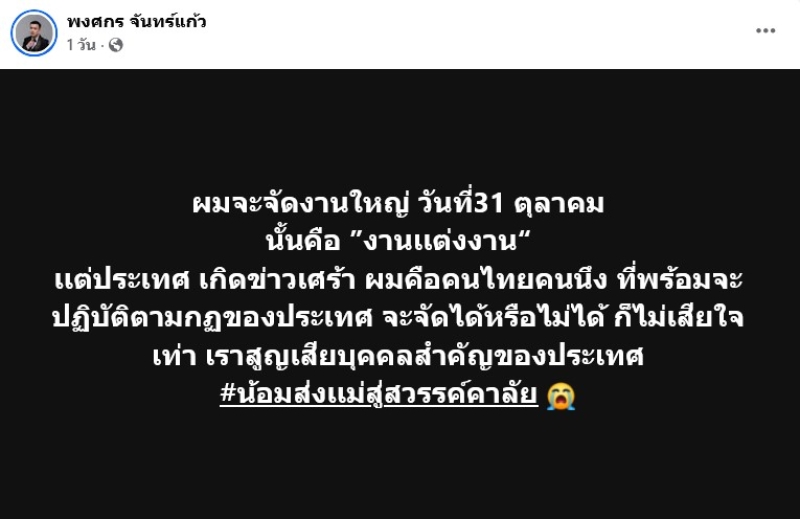 ล่าสุด เจ้าตัวได้ออกมาโพสต์ว่า ผมจะจัดงานใหญ่ วันที่31 ตุลาคม นั้นคือ ”งานเเต่งงาน“ เเต่ประเทศ เกิดข่าวเศร้า ผมคือคนไทยคนนึง ที่พร้อมจะปฏิบัติตามกฏของประเทศ จะจัดได้หรือไม่ได้ ก็ไม่เสียใจเท่า เราสูญเสียบุคคลสำคัญของประเทศ #น้อมส่งเเม่สู่สวรรค์คาลัย