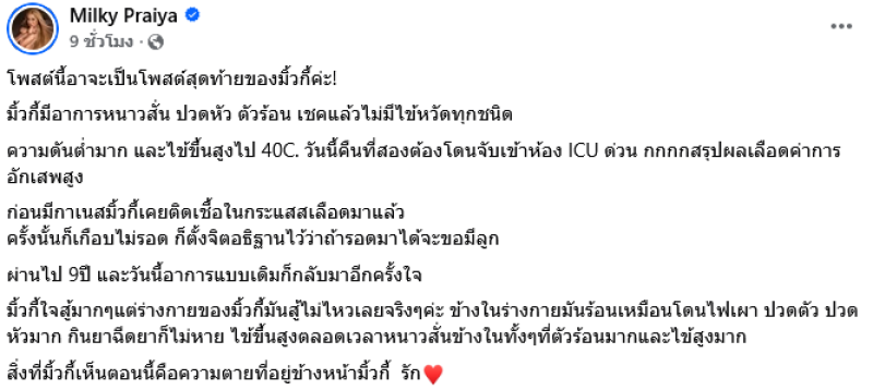 ทำเอาแฟนๆต่างเป็นห่วงเเละส่งกำลังใจให้ไม่น้อยสำหรับอินฟลูสาวชื่อดังอย่าง มิ้วกี้ ไปรยา ที่โพสต์ล่าสุดได้ระบุว่าไว้ว่า โพสต์นี้อาจะเป็นโพสต์สุดท้ายของมิ้วกี้ค่ะ! มิ้วกี้มีอาการหนาวสั่น ปวดหัว ตัวร้อน เชคแล้วไม่มีไข้หวัดทุกชนิด ความดันต่ำมาก และไข้ขึ้นสูงไป 40C. วันนี้คืนที่สองต้องโดนจับเข้าห้อง ICU ด่วน กกกกสรุปผลเลือดค่าการอักเสพสูง