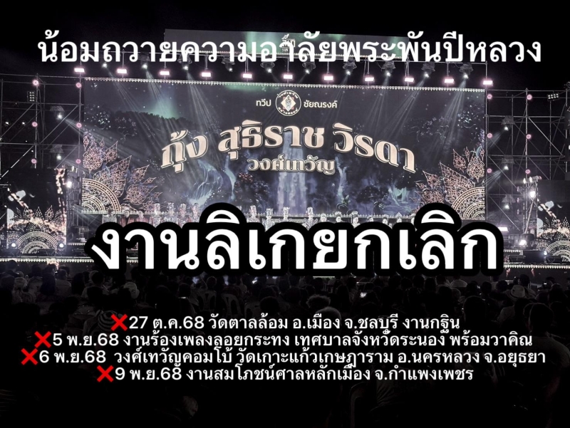 ล่าสุดทางด้านพระเอกลิเกชื่อดัง กุ้ง สุธิราช ได้ออกมาโพสต์ประกาศยกเลิกงานเพื่อน้อมถวายความอาลัยพระพันปีหลวง โดยระบุว่า ทางเจ้าภาพแจ้งยกเลิกก่อนนะครับ