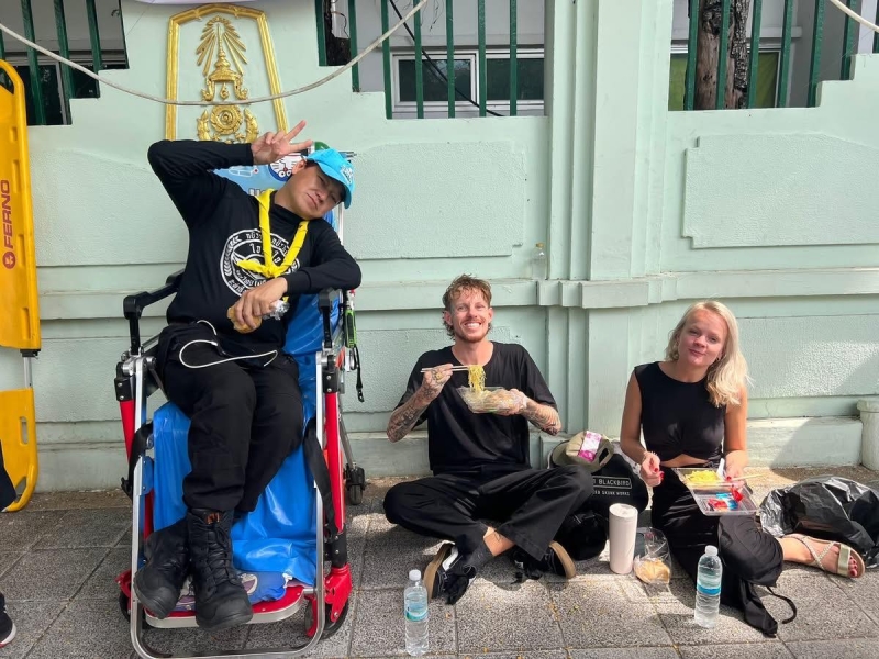 ก็เลยขออนุญาตใช้พื้นที่ตรงริมถนนตรงนี้ในการจัดบูธน้ำต่างๆ ขนม แล้วก็มีน้องอาสาสมัครที่มาจากต่างจังหวัดมาช่วยดูแลในเรื่องของการแพทย์เบื้องต้น เราเรียนรู้ประสบการณ์จากงานเมื่อ 9ปีที่แล้วของในหลวงรัชกาลที่ 9เราจะรู้ว่าจริงๆ แล้วในบริบทที่เกิดขึ้นในฐานะจิตอาสาจะทำอะไรได้บ้างที่เข้าถึงตัวประชาชนได้อย่างฉับไวรวดเร็ว