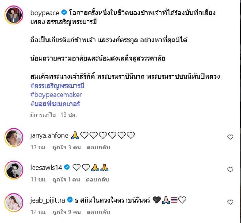 เรียกได้ว่า เป็นนักร้องหนุ่มเสียงดี อย่าง บอย พีซเมกเกอร์ ที่ล่าสุดเจ้าตัว ออกมาเผยว่าเป็นสิ่งที่ภาคภูมิใจที่สุด ที่ครั้งหนึ่งเคยร้องเพลงสรรเสริญพระบารมี โดยได้เผยว่า โอกาสครั้งหนึ่งในชีวิตของข้าพเจ้าที่ได้ร้องบันทึกเสียงเพลง สรรเสริญพระบารมี ถือเป็นเกียรติแก่ข้าพเจ้า และวงศ์ตระกูล อย่างหาที่สุดมิได้