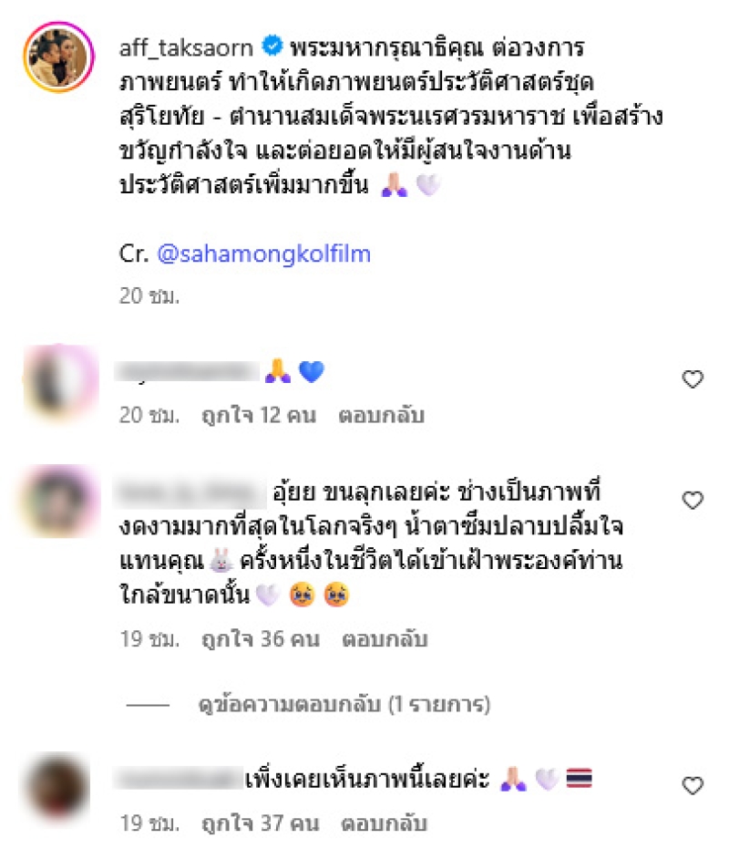 ล่าสุดนางเอกสาว แอฟ ทักษอร ได้โพสต์ภาพในอดีตสมัยเล่นภาพยนตร์ตำนานสมเด็จพระนเรศวรมหาราช พร้อมเขียนว่า พระมหากรุณาธิคุณ ต่อวงการภาพยนตร์ ทำให้เกิดภาพยนตร์ประวัติศาสตร์ชุด สุริโยทัย - ตำนานสมเด็จพระนเรศวรมหาราช เพื่อสร้างขวัญกำลังใจ และต่อยอดให้มีผู้สนใจงานด้านประวัติศาสตร์เพิ่มมากขึ้น
