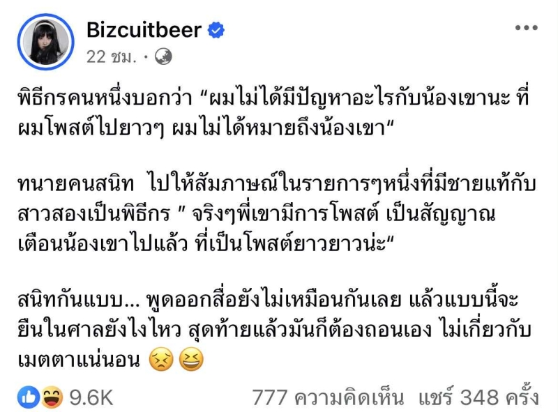เรียกได้ว่า กลายเป็นประเด็นที่โลกออนไลน์ต้องจับตามองอีกครั้ง เมื่อนักร้องสาวเสียงใส เบียร์ เดอะวอยซ์ ออกมาโพสต์ข้อความผ่านเฟซบุ๊ก Bizcuitbeer พูดถึงสองบุคคลชื่อดังในวงการ ทั้งพิธีกร และ ทนาย ที่ดูเหมือนจะมีมุมมองต่อเหตุการณ์เดียวกันไม่ตรงกัน จนเจ้าตัวถึงกับตั้งคำถามแสบๆ ว่า สนิทกันแบบนี้จริงเหรอ