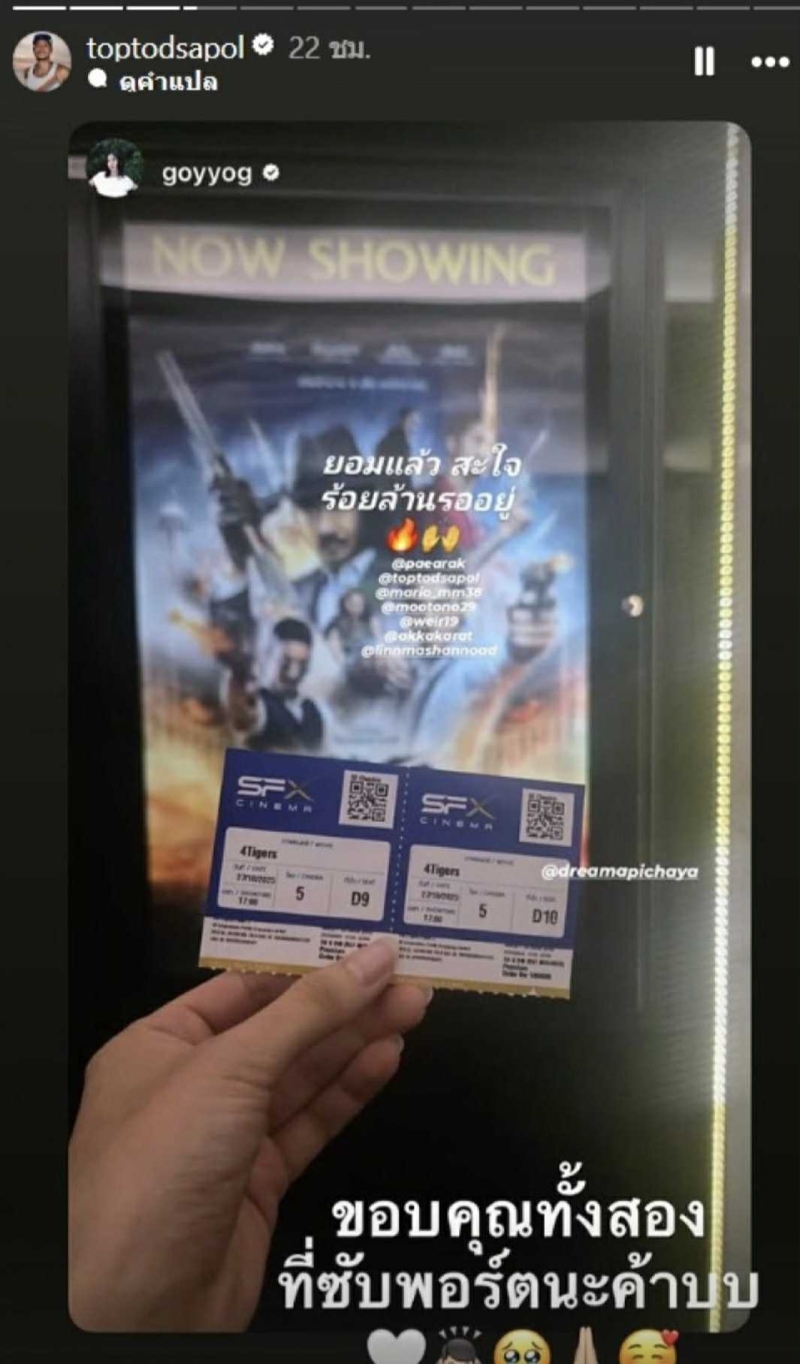 ล่าสุด สาวก้อยทำแฟนๆ ฟินหนัก หลังโพสต์สตอรี่รูปตั๋วหนังเรื่อง เสือ พร้อมแท็กตรงถึงหนุ่มท็อป ทำให้หลายคนมองว่า เป็นสัญญาณน่ารักระหว่างเพื่อนที่มีเคมีพิเศษ