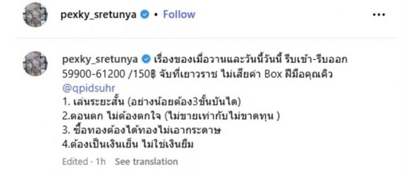 ข้อความดังกล่าวสะท้อนถึงแนวคิดการลงทุนอย่างมีวินัย และรอบคอบของเป็กกี้ ที่แม้จะมาจากสายบันเทิง แต่ก็ให้ความสำคัญกับการบริหารการเงินไม่แพ้มืออาชีพในตลาดทองคำ