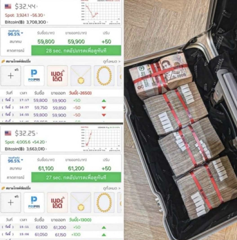 ซึ่ง เผยให้เห็นกระเป๋าเดินทางที่บรรจุเงินสดเป็นปึกๆ พร้อมข้อความเล่าประสบการณ์การลงทุนทองคำแบบเข้าใจลึกว่า เรื่องของเมื่อวาน และ วันนี้วันนี้ รีบเข้า-รีบออก 59900-61200 /150฿ จับที่เยาวราช ไม่เสียค่า Box ฝีมือคุณคิว @qpidsuhr