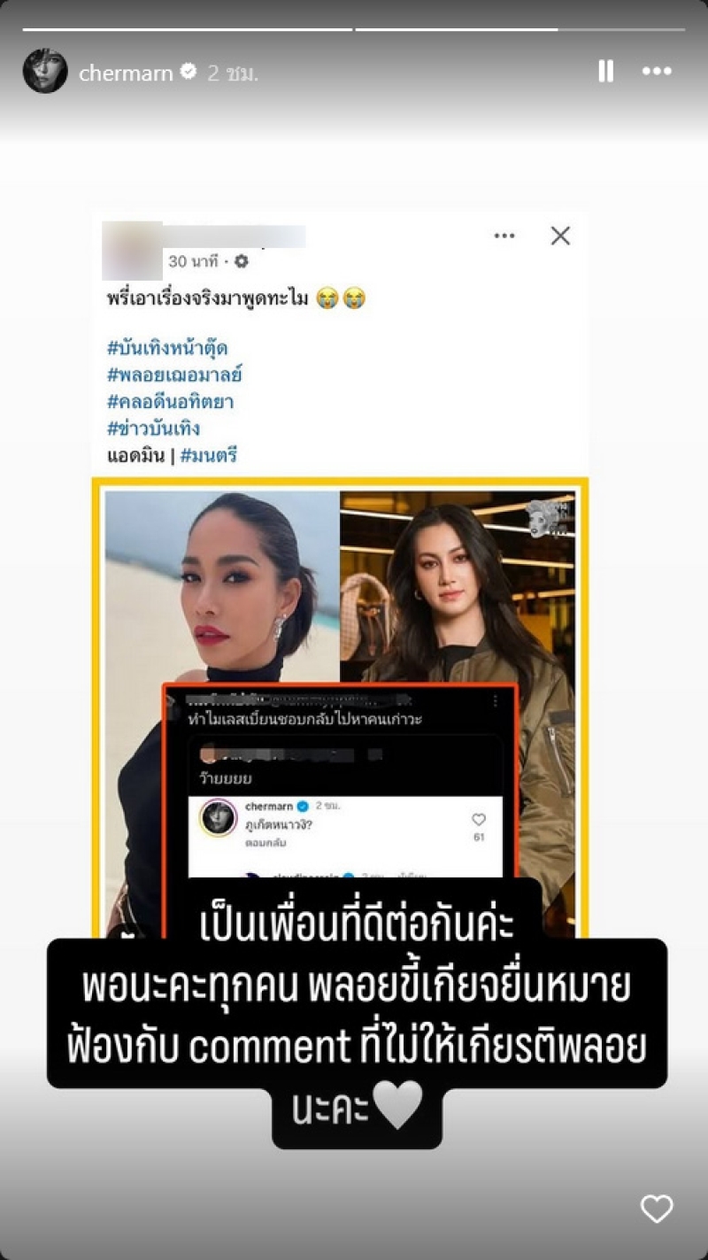 ทำเอานางเอกสาว พลอย เฌอมาลย์ ต้องรีบออกมาชี้แจงอย่างชัดเจนเมื่อได้มีการเข้าไปคอมเมนต์ถึงอดีตรักเก่าอย่าง คลอดีน อทิตยา จนถูกจับตาเเละสงสัยว่าถ่านไฟเก่าจะปะทุหรือเปล่า