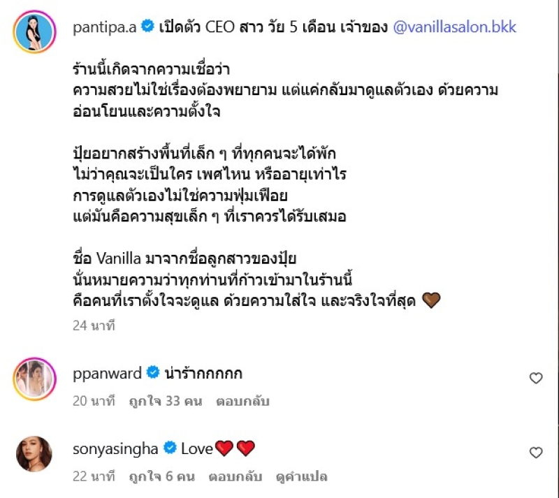 เรียกได้ว่า เป็นคุรแม่ที่สวยและแซ่บมาก อย่าง ปุ้มปุ้ย พรรณทิพา ที่มีลูกชายสุดหล่อ และ มีลูกสาวสุดน่าน่ารัก ล่าสุด เจ้าตัวได้เปิดหน้าลูกสาวแล้ว พร้อมประกาศข่าวดีเปิดร้านใหม่ พร้อมระบุข้อวคามว่า เปิดตัว CEO สาว วัย 5 เดือน เจ้าของ @vanillasalon.bkk ร้านนี้เกิดจากความเชื่อว่า ความสวยไม่ใช่เรื่องต้องพยายาม แต่แค่กลับมาดูแลตัวเอง ด้วยความอ่อนโยนและความตั้งใจ