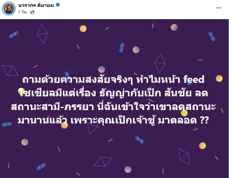 จากกรณีที่ก่อนหน้านั้น กำลังมีประเด็นเกี่ยวกับ เป๊ก สัณณ์ชัย และ ธัญญ่า ธัญญาเรศ ที่ก่อนหน้านั้นได้ออกมาประกาศว่าลดสถานะสามีภรรยาลง เหลือแค่หน้าที่ของพ่อและแม่ที่ดีต่อลูกสาวนั้นเอง ล่าสุด ทางอดีผู้ประกาศข่าวที่ผันตัวมาเป็นพิธีกรดัง อย่าง ต๊ะ นารากร ติยายน ได้โพสต์ว่า ถามด้วยความสงสัยจริงๆ ทำไมหน้า feed โซเชียลมีแต่เรื่อง ธัญญ่ากับเป็ก สันชัย ลดสถานะสามี-ภรรยา นี่ฉันเข้าใจว่าเขาลดสถานะมานานแล้ว เพราะคุณเป็กเจ้าชู้ มาตลอด ??