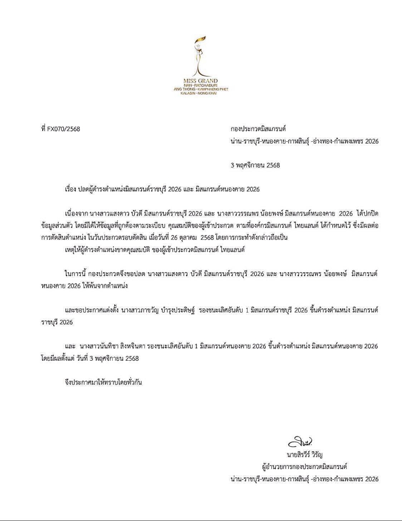 ในการนี้ กองประกวดจึงขอปลด นางสาวแสงดาว บัวดี มิสแกรนด์ราชบุรี 2026 และ นางสาววรรณพร น้อยพงษ์ มิสแกรนด์ หนองคาย 2026 ให้พ้นจากตําแหน่ง