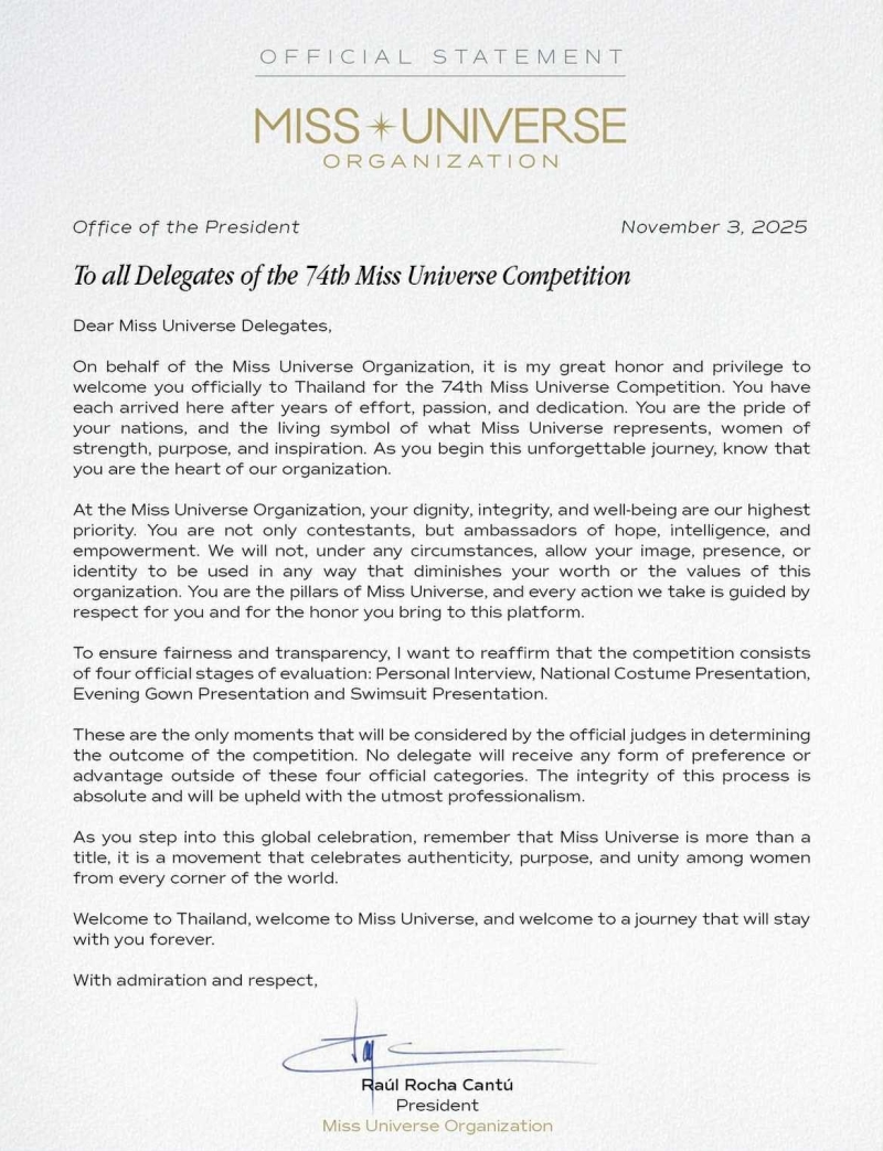 เรียกได้ว่า เป็นการเปิดฉากอย่างเป็นทางการของเวทีนางงามระดับโลก เมื่อ Raúl Rocha Cantú หรือที่แฟนๆ เรียกกันว่า ป๋าราอูล ประธานองค์กรมิสยูนิเวิร์ส ได้ออกแถลงการณ์ต้อนรับผู้เข้าประกวดจากทั่วโลกสู่ประเทศไทย สำหรับการแข่งขัน Miss Universe ครั้งที่ 74 พร้อมยืนยันจุดยืนขององค์กรเรื่องความโปร่งใส ยุติธรรม และให้เกียรติผู้หญิงในทุกมิติ