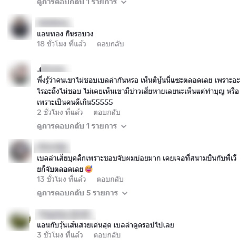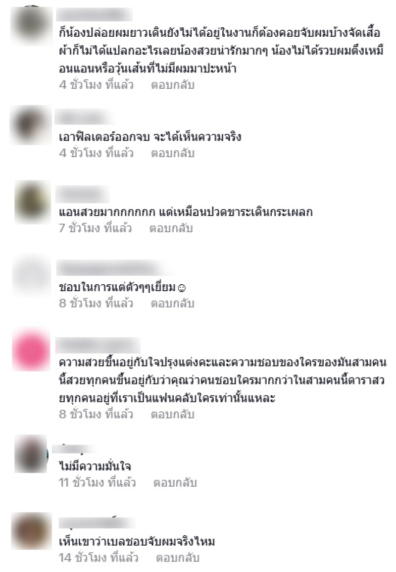 โดยมีแฟนๆหลายคนต่างเข้ามาคอมเมนต์ทักและเตือนด้วยความเป็นห่วงที่อาจทำให้ดูเสียบุคลิกกันอย่างมาก อาทิ ก็ผมสวยอ่ะ ลูบแล้วมันทำไม,เบลล่าเสียบุคลิกเพราะชอบจับผมบ่อยมาก เคยเจอที่สนามบินกับพี่เวียก็จับตลอดเลย,ฝากคุณผู้จัดการบอกน้องเบลหน่อยค่ะ อย่าจับผมบ่อยๆ เสียบุคลิก น้องสวยอยู่แล้วค่ะ,เห็นเขาว่าเบลชอบจับผมจริงไหม