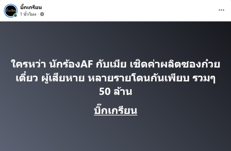 วันที่ 5 พ.ย. 68 ทางเพจดัง อย่าง บิ๊กเกรียน ได้ออกมาเปิดประเด็น โดยได้โพสต์ว่า ใครหว่า นักร้องAF กับเมีย เชิดค่าผลิตซองก๋วยเตี๋ยว ผู้เสียหาย หลายรายโดนกันเพียบ รวมๆ 50 ล้าน