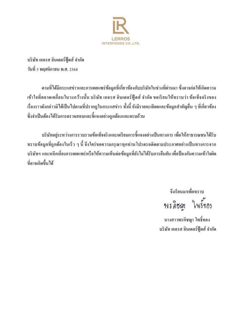ตามที่ได้มีกระแสข่าวและการเผยแพร่ข้อมูลที่เกี่ยวข้องกับบริษัทในช่วงที่ผ่านมา ซึ่งอาจก่อให้เกิดความ เข้าใจที่คลาดเคลื่อนในวงกว้างนั้น บริษัท เลอรส อินเตอร์ฟูดส์ จํากัด ขอเรียนให้ทราบว่า ข้อเท็จจริงของ เรื่องราวดังกล่าวมิได้เป็นไปตามที่ปรากฏในกระแสข่าว ทั้งนี้ ยังมีรายละเอียดและข้อมูลสําคัญอื่น ๆ ที่เกี่ยวข้อง ซึ่งจําเป็นต้องได้รับการตรวจสอบและชี้แจงอย่างถูกต้องและครบถ้วน