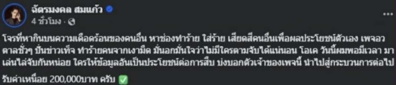 โดย เจ้าตัว โพสต์ข้อความผ่านเฟซบุ๊กส่วนตัว ฉัตรมงคล สมแก้ว ระบุชัดว่า ไม่ขอทนกับการถูกใส่ร้ายอีกต่อไป พร้อมเรียกผู้ที่อยู่เบื้องหลังว่า เป็นโจรในเงามืด ที่หาผลประโยชน์จากความเดือดร้อนของผู้อื่น และยืนยันว่า จะเอาเรื่องให้ถึงที่สุด