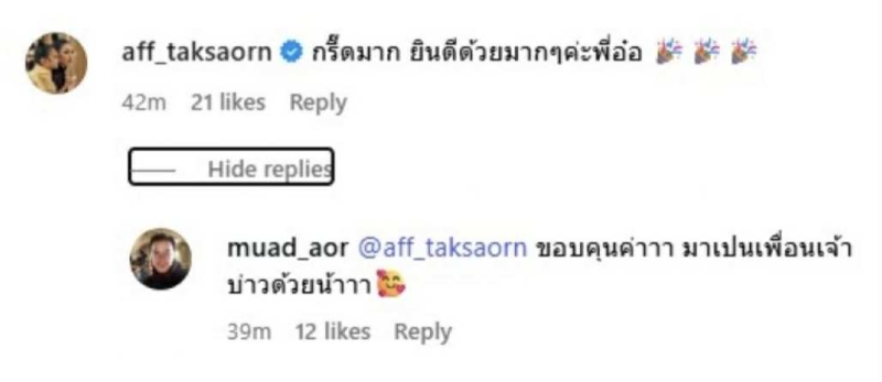ทันทีที่โพสต์ถูกเผยแพร่ออกไป เหล่าคนบันเทิง และ แฟนคลับต่างเข้ามาคอมเมนต์ร่วมแสดงความยินดีอย่างอบอุ่น หนึ่งในนั้นคือ แอฟ ทักษอร ที่เข้ามาแสดงความยินดีด้วยข้อความสุดน่ารักว่า กรี๊ดมาก ยินดีด้วยมากๆ ค่ะพี่อ๋อ