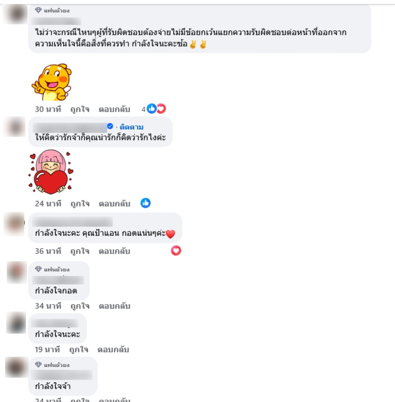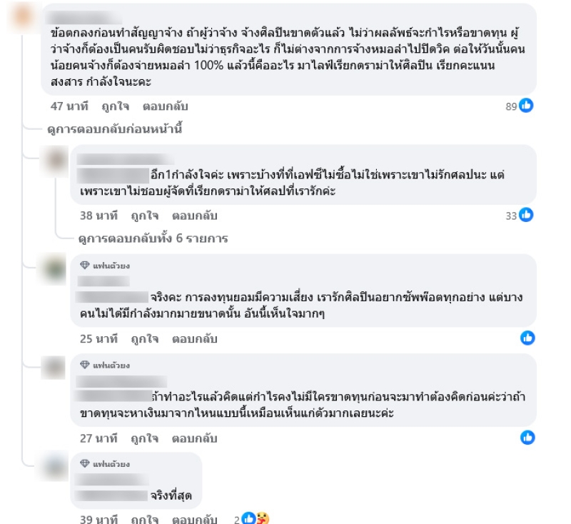 โดยมีแฟนคลับเข้ามาคอมเมนต์ถึงเรื่องการสัญญาจ้างเเละส่งกำลังใจว่า ข้อตกลงก่อนทำสัญญาจ้าง ถ้าผู้ว่าจ้าง จ้างศิลปินขาดตัวแล้ว ไม่ว่าผลลัพธ์จะกำไรหรือขาดทุน ผู้ว่าจ้างก็ต้องเป็นคนรับผิดชอบไม่ว่าธุรกิจอะไร ก็ไม่ต่างจากการจ้างหมอลำไปปิดวิค ต่อให้วันนั้นคนน้อยคนจ้างก็ต้องจ่ายหมอลำ 100% แล้วนี้คืออะไร มาไลฟ์เรียกดราม่าให้ศิลปิน เรียกคะแนนสงสาร กำลังใจนะคะ
