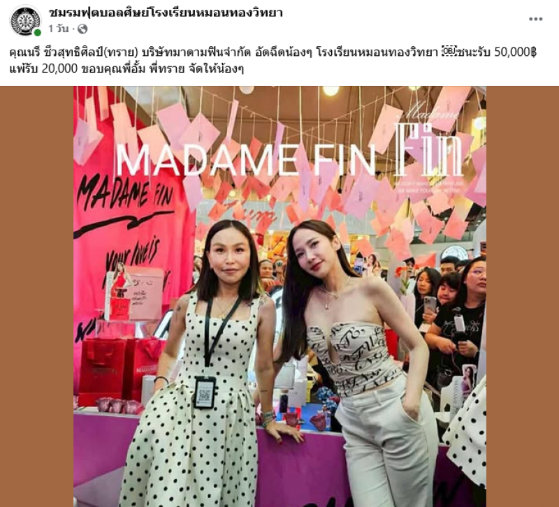 ล่าสุดเพจ ชมรมฟุตบอลศิษย์หมอนทองวิทยา โพสต์อัปเดตขอบคุณสองซุปตาร์ใจป๋า อั้ม พัชราภา และ ทราย มาดามฟิน ที่ร่วมอัดฉีดกำลังใจให้ทีม โดยระบุว่า คุณนรี ชีวสุทธิศิลป์ (ทราย) บริษัทมาดามฟินจำกัด อัดฉีดน้องๆ หมอนทองวิทยา - ชนะรับ 50,000 บาท แพ้รับ 20,000 บาท ขอบคุณพี่อั้ม พี่ทราย จัดให้น้องๆ