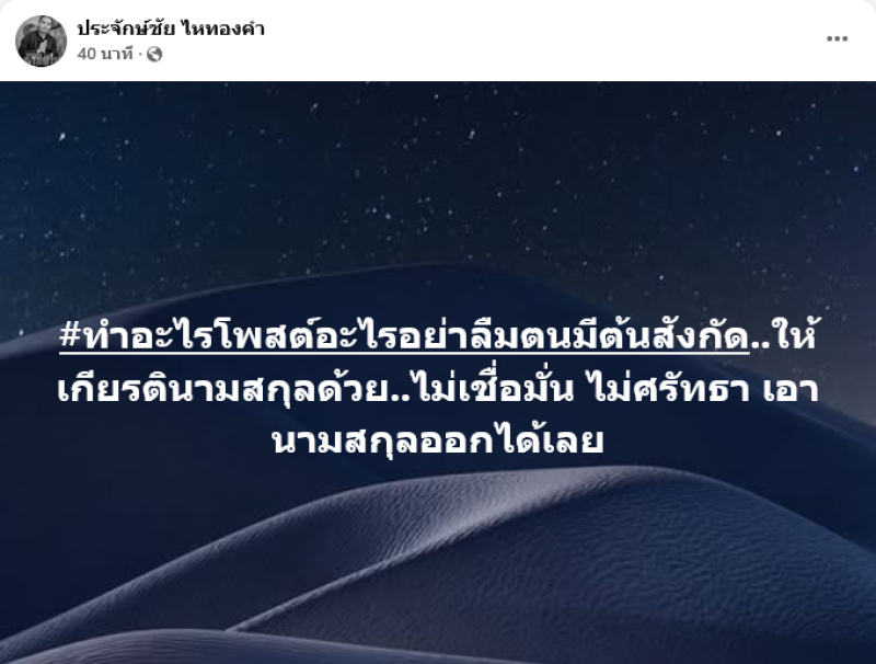 ทำเอาชาวเน็ตต่างเข้ามาคอมเมนต์กันอย่างมากเมื่อ นายห้างประจักษ์ชัย ไหทองคำ ได้ออกมาโพสต์ข้อความระบุว่า #ทำอะไรโพสต์อะไรอย่าลืมตนมีต้นสังกัด..ให้เกียรตินามสกุลด้วย..ไม่เชื่อมั่น ไม่ศรัทธา เอานามสกุลออกได้เลย