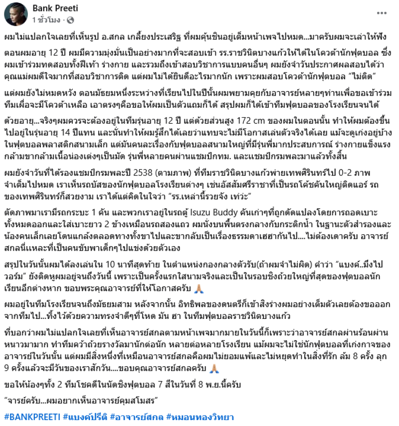 เป็นที่น่าสนใจกันไม่น้อยสำหรับวงการกีฬาสำหรับ อ.สกล เกลี้ยงประเสริฐ ล่าสุด ได้มีภาพในอดีตว่อนโซเชียลอีกครั้ง โดยเป็นภาพ อ.สกล ถ่ายกับนักเรียนที่เป็นนักกีฬาฟุตบอลเมื่อประมาณ 30 ปีก่อน ซึ่งทำเอาหลายคนต่างสะดุดเมื่อมีภาพเด็กหนุ่มหน้าคุ้น นั่นคือ แบงค์ ปรีติ