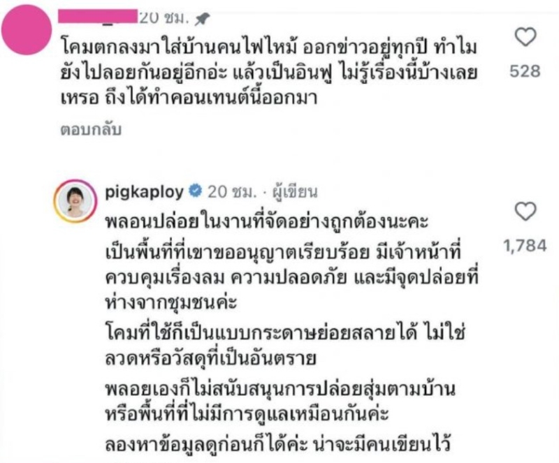 ด้านพลอยเองก็ไม่ปล่อยให้รอช้า รีบมาตอบกลับทันทีว่า พลอยปล่อยในงานที่จัดอย่างถูกต้องนะคะ เป็นพื้นที่ที่เขาขออนุญาตเรียบร้อย มีเจ้าหน้าที่ควบคุมเรื่องลม ความปลอดภัย และมีจุดปล่อยที่ห่างจากชุมชนค่ะ โคมที่ใช้ก็เป็นแบบกระดาษย่อยสลายได้ ไม่ใช่วัสดุหรือวัสดุที่เป็นอันตราย พลอยเองก็ไม่สนับสนุนการปล่อยสุ่มตามบ้านหรือพื้นที่ที่ไม่มีการดูแลเหมือนกันค่ะ ลองหาข้อมูลดูก่อนก็ได้ค่ะ น่าจะมีคนเขียนไว้เยอะเลย