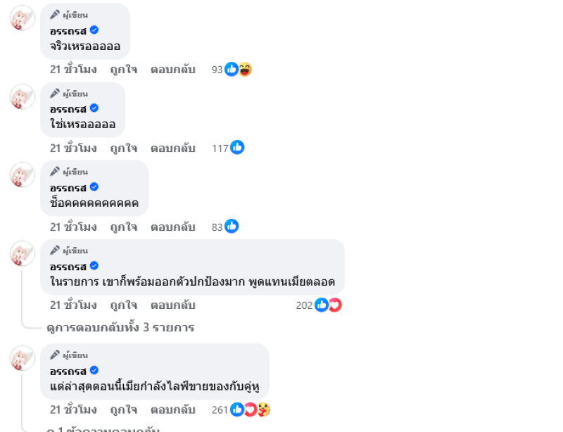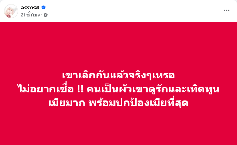 ทำเอาโซเชียลต่างไม่อยากเชื่อเมื่อเพจดังอย่าง อรรถรส ได้ออกมาเปิดประเด็นถึงคู่รักคู่ดังว่า เขาเลิกกันแล้วจริงๆ เหรอ ไม่อยากเชื่อ คนเป็นผัวเขาดูรักและเทิดทูนเมียมาก พร้อมปกป้องเมียที่สุด พร้อมคอมเมนต์เพิ่มเติมว่า ในรายการ เขาก็พร้อมออกตัวปกป้องเมียมาก พูดแทนตลอด