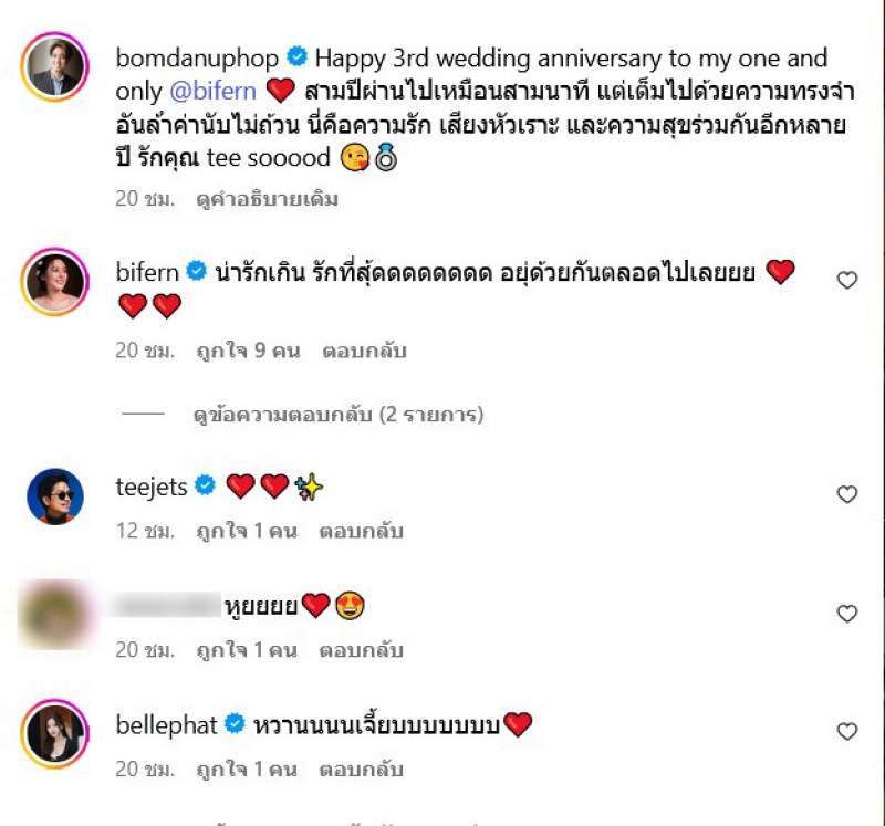เรียกได้ว่า เป็นนักแสดงสาว อย่าง ใบเฟิร์น อัญชสา ที่ได้แต่งงานกับ แฟนหนุ่ม บอม ดนุภพ ในช่วงที่กำลังปังสุดๆ จนทำเอาหลายคนพูดว่ารีบแต่งเร็วเกินไป เพราะกำลังปัง ล่าสุด ทางบอม ดนุภพ ได้ออกมาโพสต์ครบแต่งงาน โดยได้เผยว่า Happy 3rd wedding anniversary to my one and only @bifern สามปีผ่านไปเหมือนสามนาที แต่เต็มไปด้วยความทรงจําอันล้ําค่านับไม่ถ้วน นี่คือความรัก เสียงหัวเราะ และความสุขร่วมกันอีกหลายปี รักคุณ tee sooood
