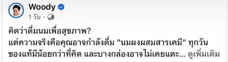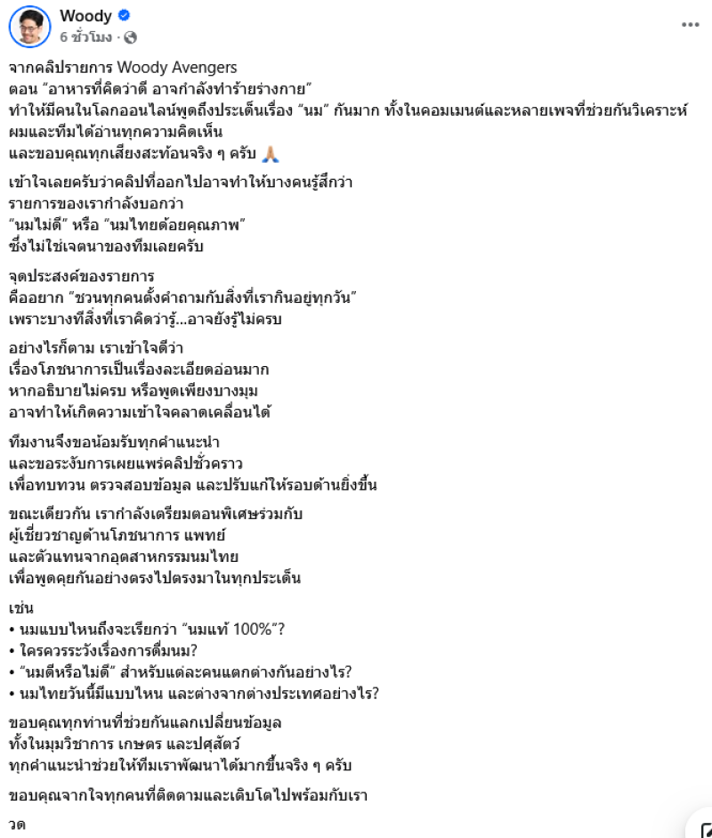 ล่าสุด วู้ดดี้ ได้ออกมาโพสต์ข้อความชี้แจง โดยยืนยันว่าไม่ได้มีเจตนาที่จะบอกว่านมไม่ดี หรือนมไทยไม่ได้คุณภาพ จุดประสงค์รายการคืออยากชวนทุกคนตั้งคำถามกับสิ่งที่กินอยู่ทุกวัน เพราะบางสิ่งที่รู้อาจยังรู้ไม่ครบ เข้าใจว่าข้อมูลโภชนาการเป็นเรื่องละเอียดอ่อน ถ้าอธิบายไม่ครบ หรือพูดบางมุม อาจทำให้คนเข้าใจผิดได้ ประกาศระงับการเผยแพร่คลิปชั่วคราว เพื่อทบทวน ตรวจสอบข้อมูล และปรับแก้ให้รอบด้านยิ่งขึ้น