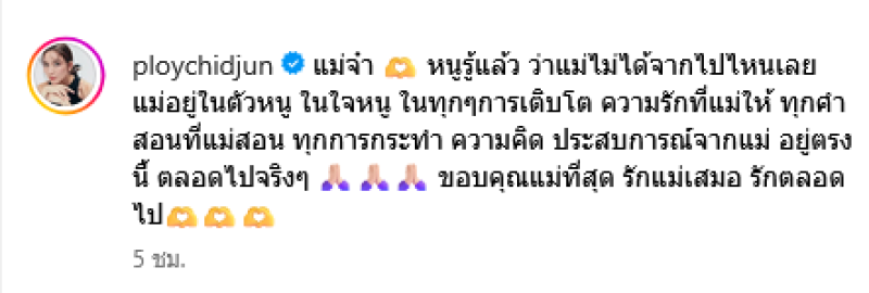 ล่าสุด พลอย ได้ออกมาเคลื่อนไหวถึงคุณแม่ว่า แม่จ๋า หนูรู้แล้ว ว่าแม่ไม่ได้จากไปไหนเลย แม่อยู่ในตัวหนู ในใจหนู ในทุกๆการเติบโต ความรักที่แม่ให้ ทุกคำสอนที่แม่สอน ทุกการกระทำ ความคิด ประสบการณ์จากแม่ อยู่ตรงนี้ ตลอดไปจริงๆ ขอบคุณแม่ที่สุด รักแม่เสมอ รักตลอดไป