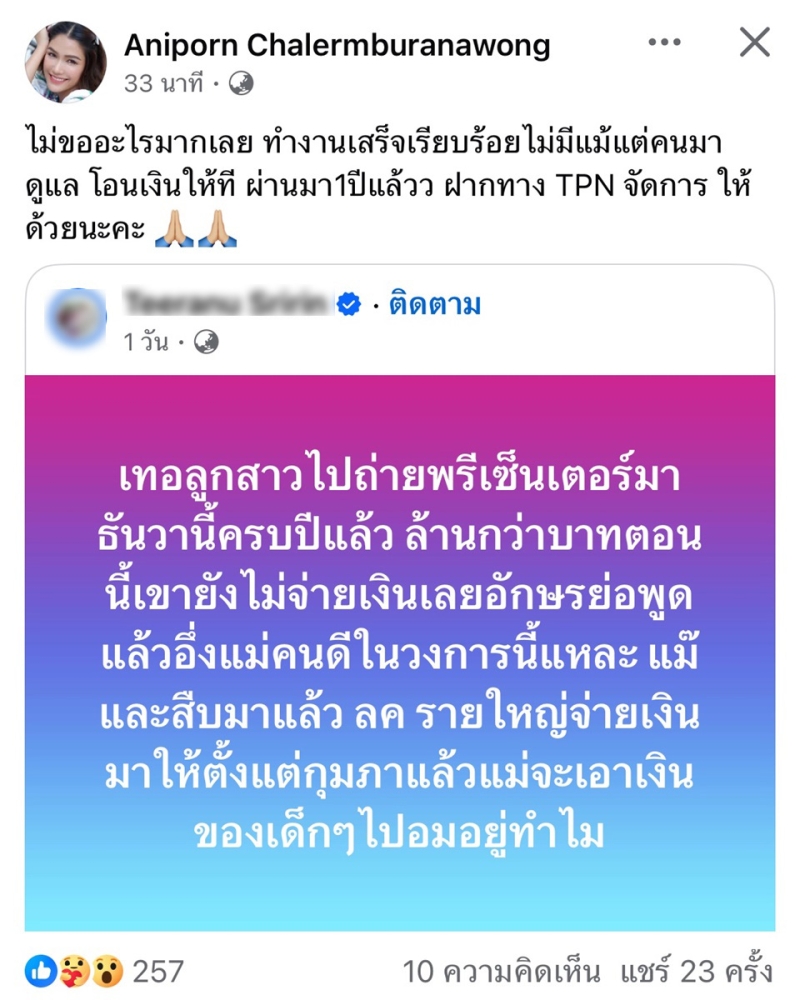 เรียกได้ว่าทำเอาโซเชียลต่างเข้ามาคอมเมนต์กันอย่างมากเมื่อแนท อนิพรณ์ มิสยูนิเวิร์สไทยแลนด์ 2015 ได้แชร์โพสต์ข้อความว่า เธอลูกสาวไปถ่ายพรีเซนเตอร์มา ธันวาคมนี้ครบปีแล้ว ล้านกว่าบาทตอนนี้เขายังไม่จ่ายเงินเลยอักษรย่อพูดแล้วอึ่ง แม่คนดีในวงการนี้แหละ แม๊และสืบมาแล้ว ลูกค้ารายใหญ่จ่ายเงินมาให้ตั้งแต่กุมภาพันธ์แล้ว แม่จะเอาเงินของเด็กๆ ไปอมอยู่ทำไม