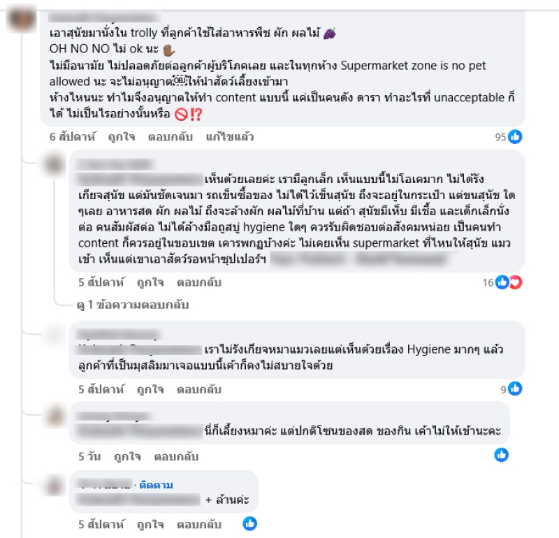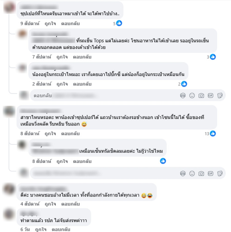 โดยมีชาวเน็ตต่างเ้ขามาคอมเมนต์ติถึงการนำน้องสุนัขเข้าไปในห้างเเละเลือกซื้อของ อาทิ ซุปเปอร์ที่ไหนครับเอาหมาเข้าได้ จะได้พาไปบ้าง,สาขาไหนหรอคะ พาน้องเข้าซุปเปอร์ได้ แถวบ้านเราต้องรอข้างนอก เข้าโซนนี้ไม่ได้ ซื้อของที เหมือนวิ่งผลัด รีบหยิบ รีบออก ,ทำตามแล้ว รปภ ไล่จับส่งรพค่า,เอาน้องเข้าโซนนี้ได้หรอคะ